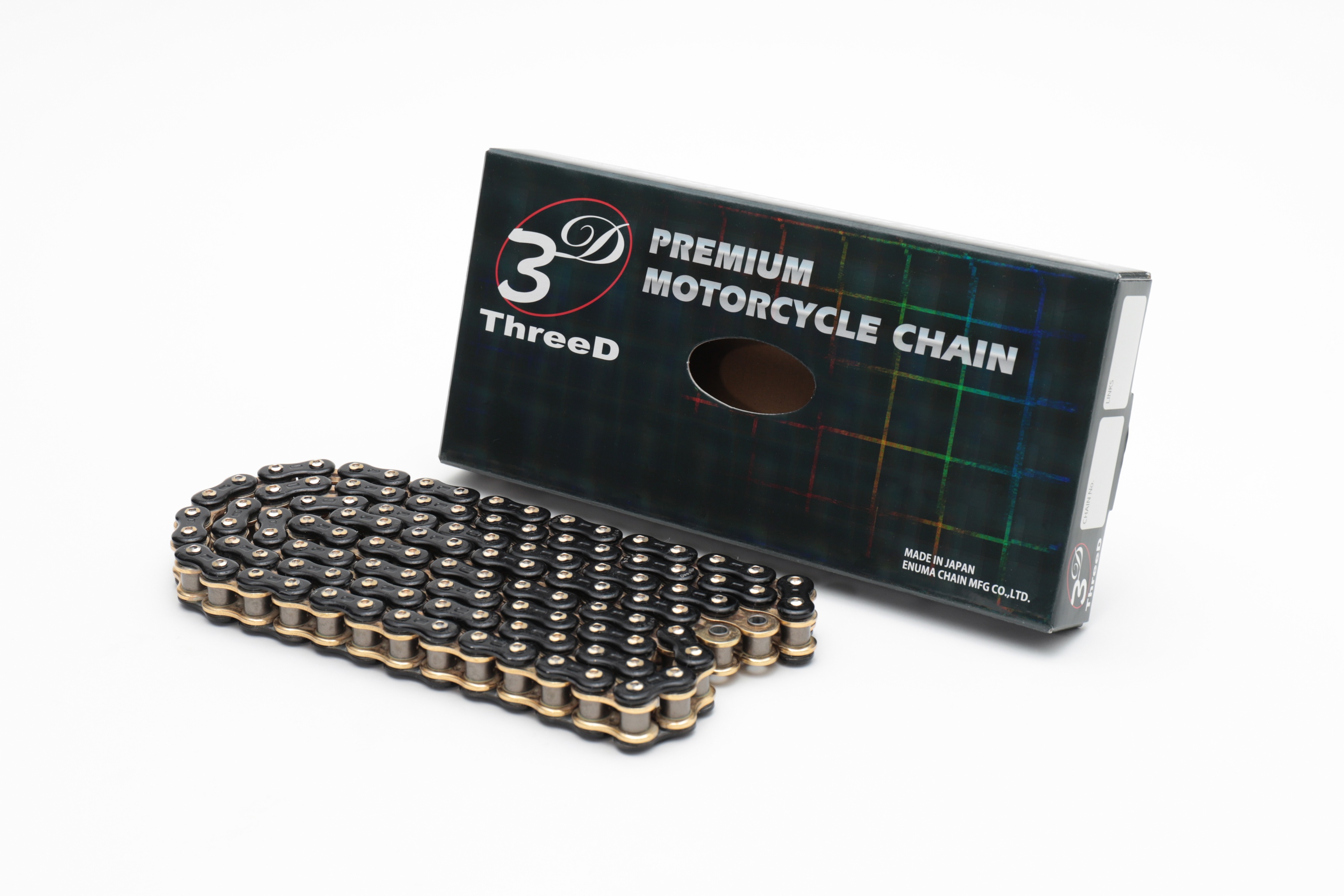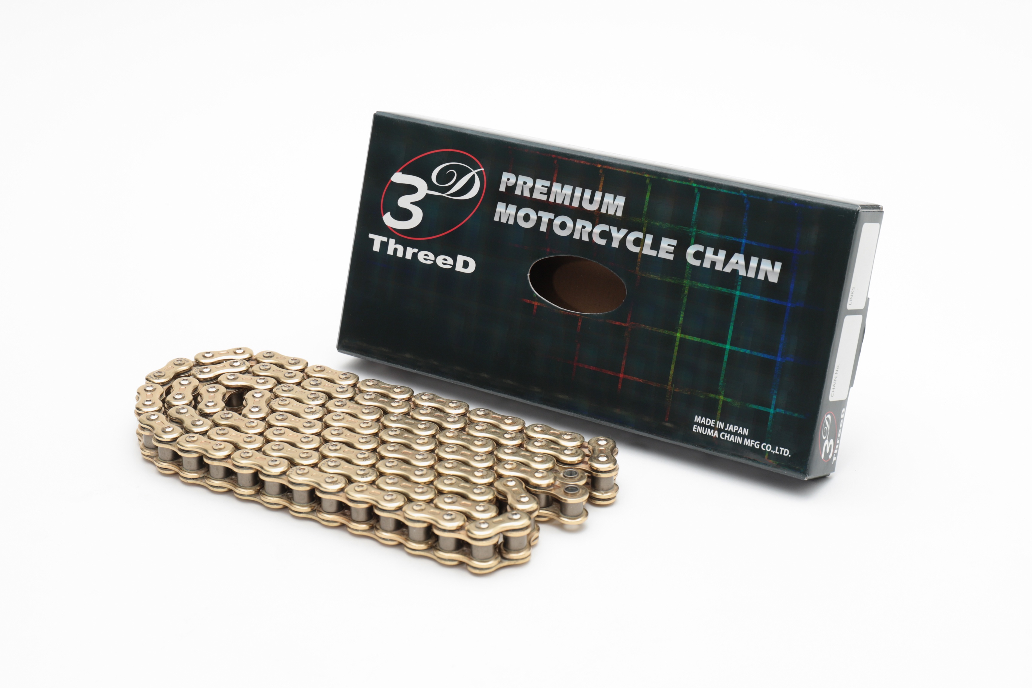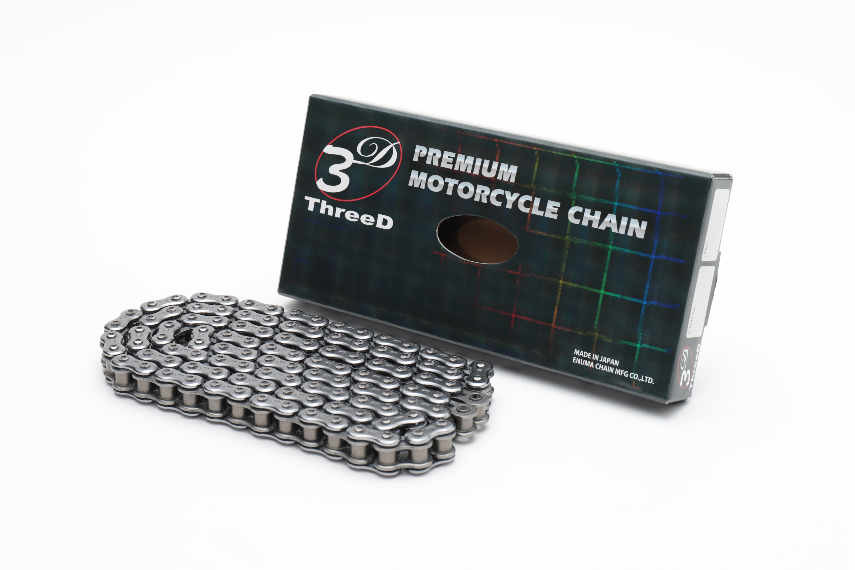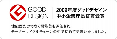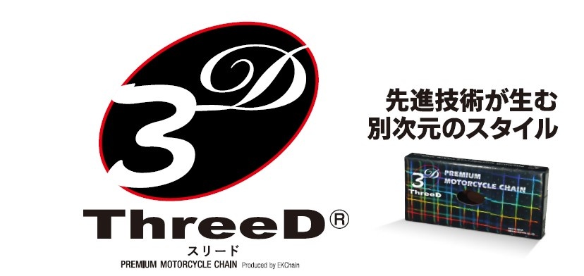 次世代型チェーン「ThreeD スリード」は、カスタムパーツとしての要素を兼ね備えたチェーンで㈱江沼チヱン製作所が最新の精密鍛造加工と技術をチェーンへ採用し生まれた商品です。2009年には、性能を突き詰めた機能美を高く評価され、グッドデザイン中小企業長官賞を受賞。モーターサイクル市場でThreeDチェーンの登場は衝撃的にチェーンの概念を変え、今までにない質感と高性能で多くの人を魅了し続けています。